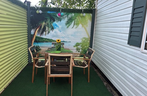 Villa Ensueño Camping is a private RV camping community with access control located in Vega Baja, Puerto Rico. The community offers a pool and 8 ball table. Right next to the front gate of the community there is a bar named Salaito with food and live music for you to enjoy. This adorable property features 2 queen beds, WiFi, Roku TV on both bedrooms with AC. Guests can relax in the cozy outside space with chairs or take advantage of the convenient amenities like the coins washing machine. The bathroom includes amenities and the shower includes water heater, shampoo and conditioner. Enjoy all that Vega Baja has to offer when you stay at the place.